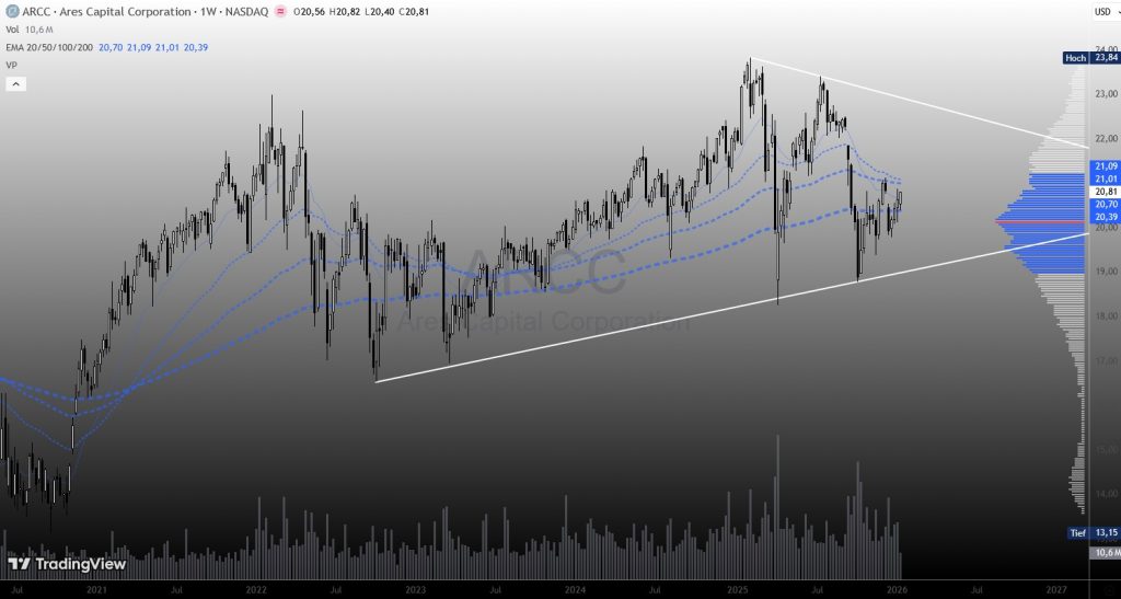 Ares Capital Corporation (ARCC, NASDAQ) im langfristigen Wochenchart über fünf Handelsjahre.