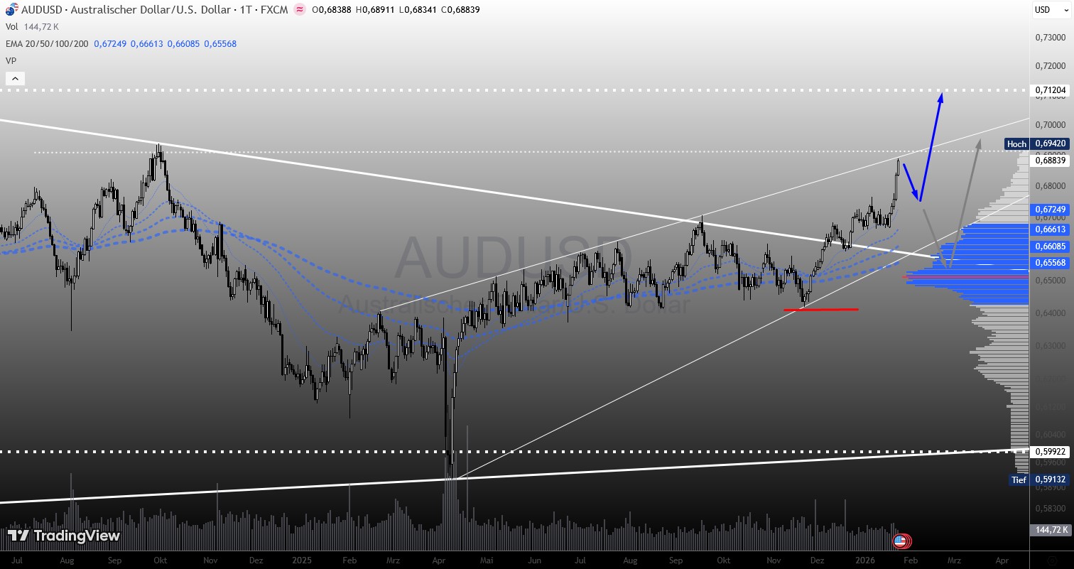 Im langfristigen Chartbild bricht der AUD/USD-Kurs aus dem jüngsten Abwärtsrend aus und kann sich von den wichtigen gleitenden Durchschnitten und dem Point-of-Control aus dem Marktprofil absetzen – dies ist deutlich bullisch zu werten. Im mittelfristigen Tageschart hat sich bereits ein junger Aufwärtstrend etabliert. Das jüngste, markttechnische Verlaufstief bietet hierzu einen möglichen Stop-Loss für eine Long-Position an.