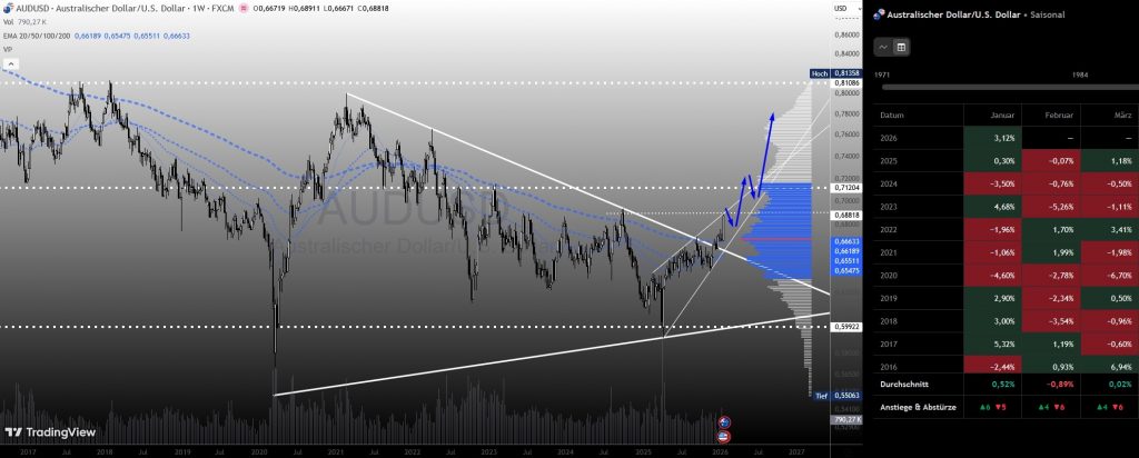 Das Major-Währungspaar AUD/USD erreicht am heutigen Freitag mit dem Rückenwind staker PMI*-Daten ein neues 15-Monats-Hoch. In Kombination mit den jüngsten australischen Arbeitsmarktdaten rechnet der Markt nunmehr mit einer baldigen Straffung der Geldpolitik der Rerservce Bank of Australia (RBA). Auch die saisonale Erwartung auf Basis einer Dekade ist bis in den März hinein deutlich positiv.