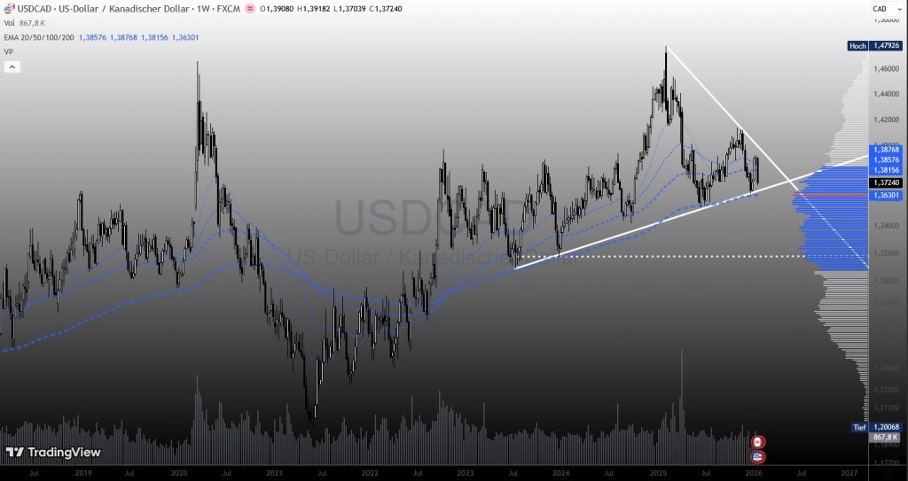 Auch der Kanadische Dollar kann zuletzt deutlich zulegen und das Währungspaar USD/CAD hängt damit charttechnisch am Seidenen Faden. Weitere Kursverluste könnten einen bärischen Cluster aktivieren und machen viel Potenzial gen Süden frei.