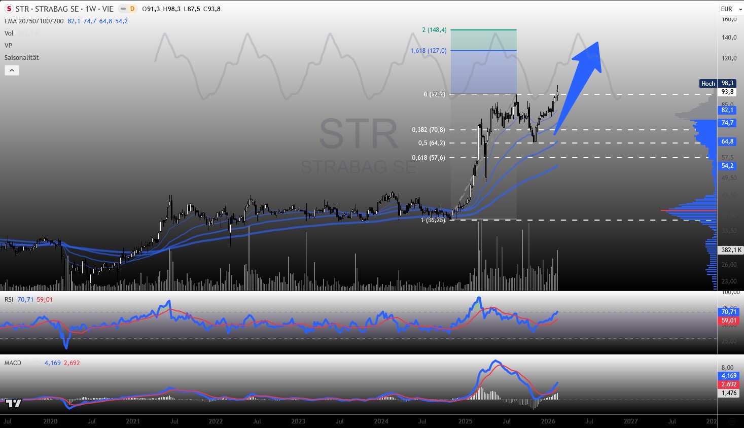 Mit der vergangenen Handelswoche erreicht die STRABAG-Aktie – nach kurzer Erholung bis zum 50er-Fibonacci-Retracement – ein neues Verlaufshoch und kann den übergeordneten Aufwärtstrend damit fortsetzen. Mit der bullischen Saisonalität im Rücken liegen die nächsten Kursziele bei nunmehr 127 Euro und später 148,40 Euro.